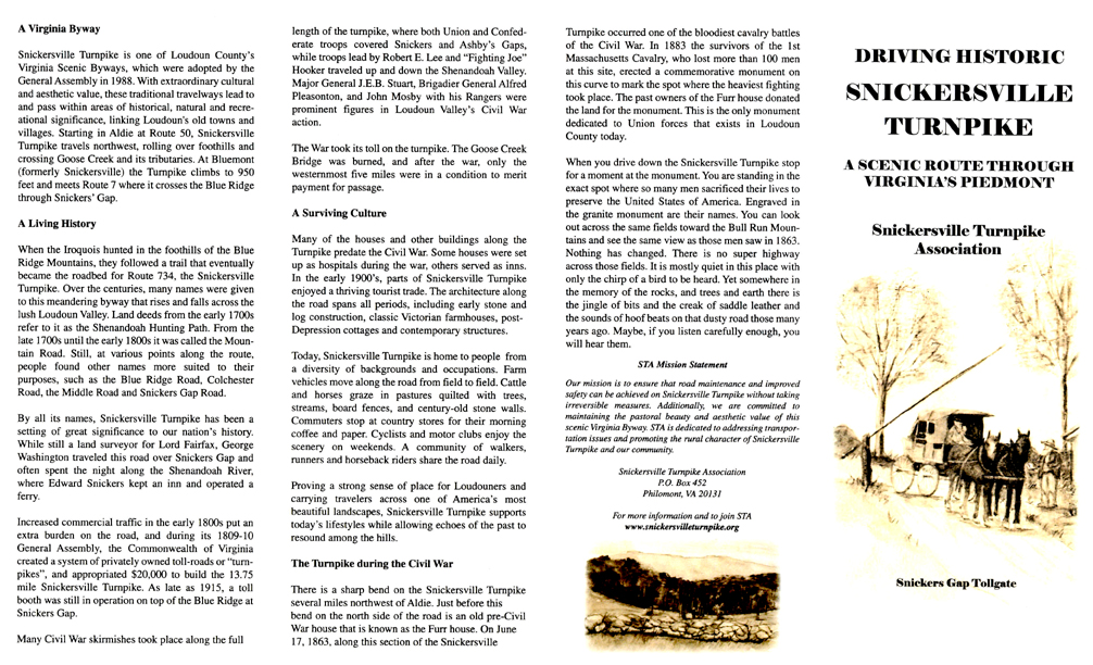 At many business locations along the 'pike, like the general stores in Bluemont and Airmont, you can pick up our "Driving Historic Snickersville Turnpike" brochure. Or, you can download it and print one for yourself, or just reference it with your cell phone.